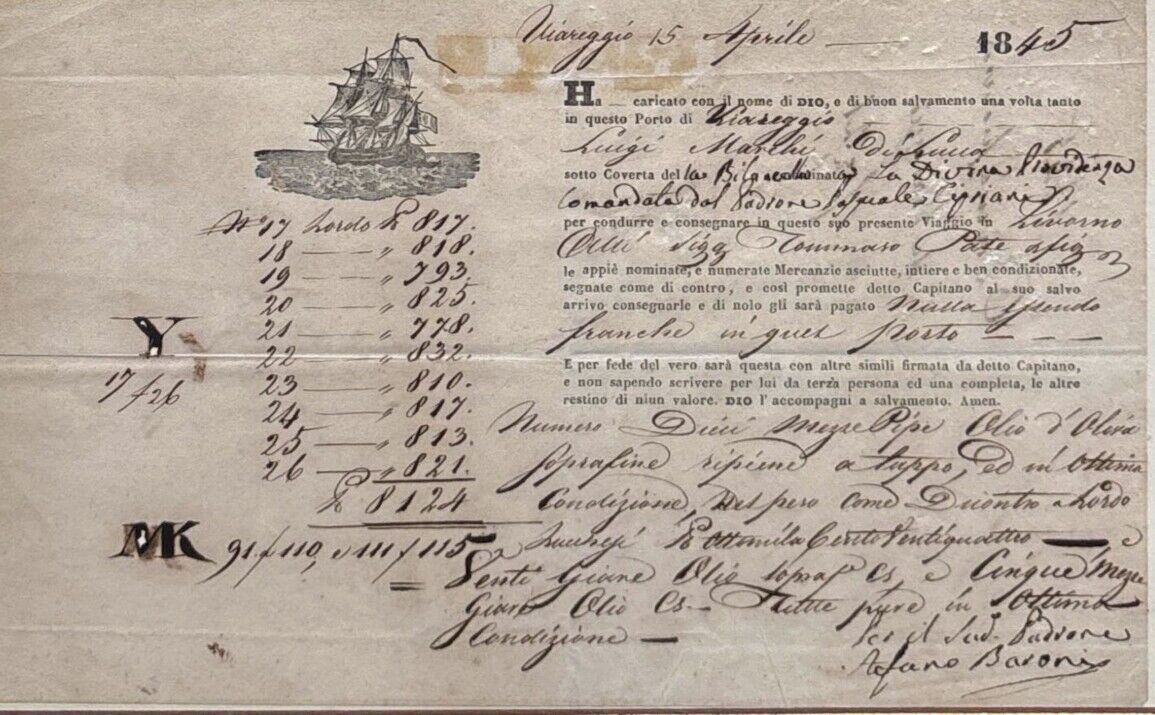 Onder de getoonde stukken springen eruit: een cognossement uit 1845 over het zeetransport van vaten olie van Viareggio naar Livorno en een poststempel uit 1930 met de tekst: “De Italiaanse olijfolie is de beste ter wereld.” Deze documenten getuigen van de trots en passie voor Italiaanse olijfolie en van haar reputatie van excellentie door de geschiedenis heen.